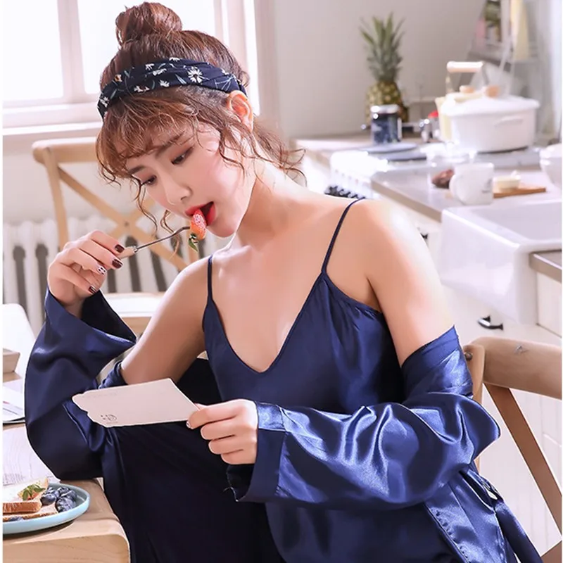 Addition Information of Sexy Pajamas Women's Spring Autumn Ice Silk Sling Soft Nightgown Female Robe Two Set Nightwear Home