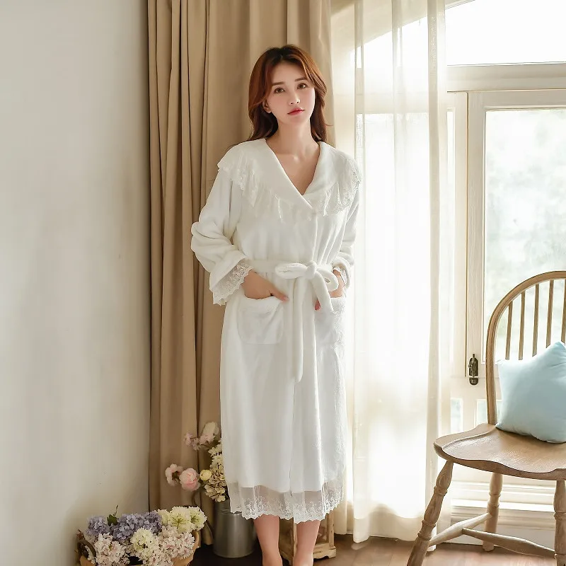 Thicken Flannel Female Nightgowns For Women Winter Warm Sweet Princess White Lace Sleepwear Feminino Nightwear Xmas Gift